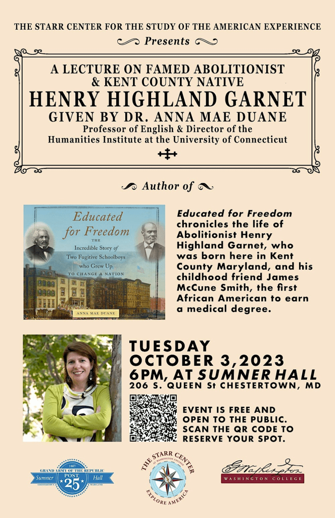 October 2, 2023: I’m heading to the birthplace of Henry Highland Garnet today. Many thanks to Jason Patterson and the Starr Center for the Study of the American Experience (at Washington College) for the invitation. I’m deeply honored to have the opportunity to speak about Henry Highland Garnet in the county where he was born. If you are in the area, please stop by!